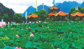 安竜県政府所在地に位置し、省クラスの重要文化財。清代(1644‐1911)中葉から現在まで招堤はハスの花でその名を知られてきました。毎年8月の盛りの時期には「蓮華祭り」が開かれその美しさと規模は「招堤十里蓮華」と称され国内外の観光客が絶えません。古跡も多く招堤、半山亭、御校場、十八先生墓(南明歴王朝の東閣大学士、呉貞敏など18人の大臣と内官が埋葬されている)など、貴州十大景勝地の一つにも数えられています。
